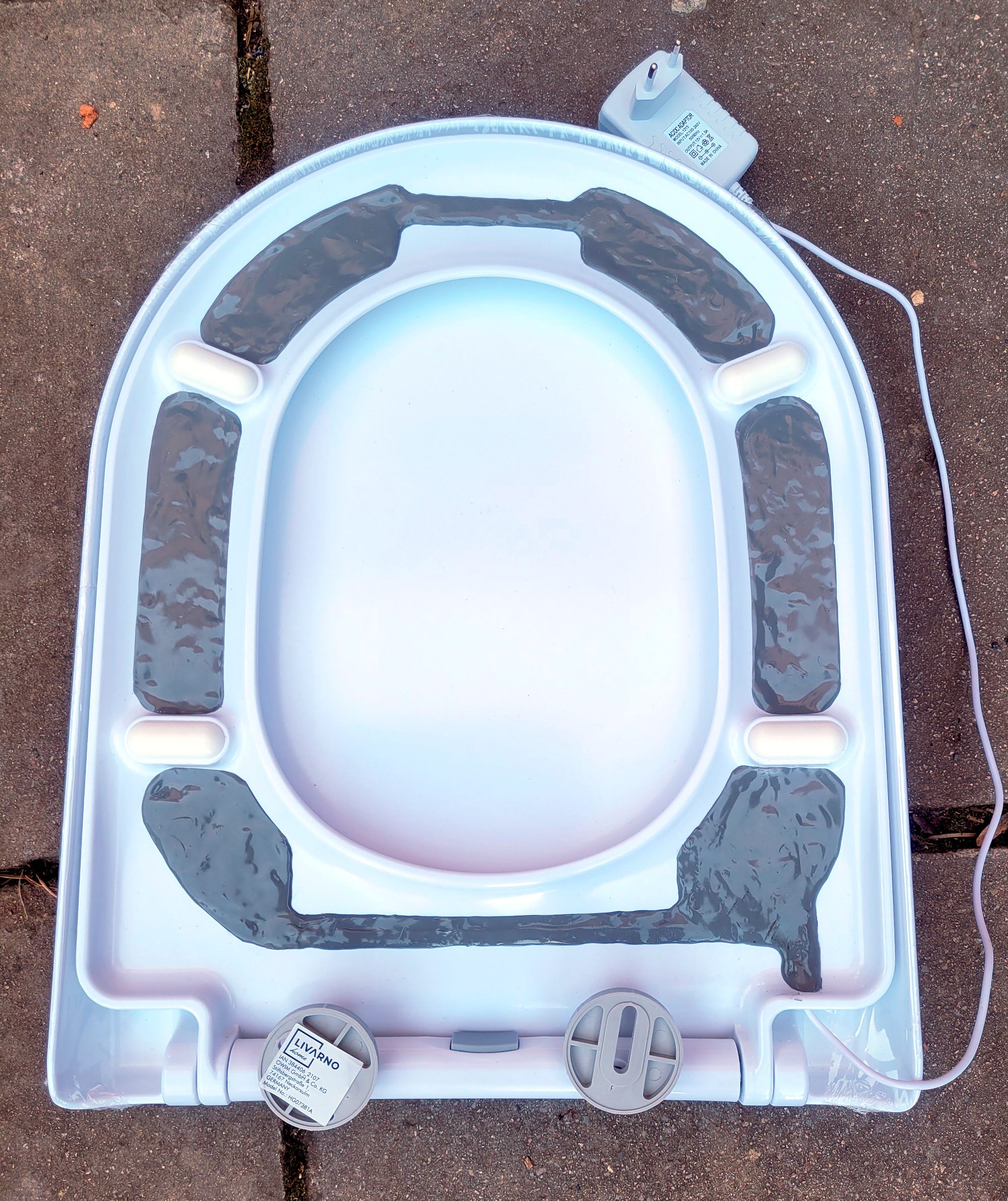 Na zákazníkem dodané záchodové sedátko připevníme odporové lanko, naspojkujeme k lanku přívod od adaptéru 230 V / 12 V a zalijeme vhodným typem šedého silikonu, který má dobrou přilnavost a odolnost proti běžným chemikáliím. Příkon vyhřívání je 9 W, předpokladem správné funkce je zavírat záchod víkem – pak při teplotě prostoru okolo 20 stupňů C má teplota dosedací plochy příjemnou hodnotu okolo 33 stupnů C. Provedení vyhřívání sedátka je podle užitného vzoru č. 27647 vydaného Úřadem průmyslového vlastnictví Praha, je zřejmé z této skici: